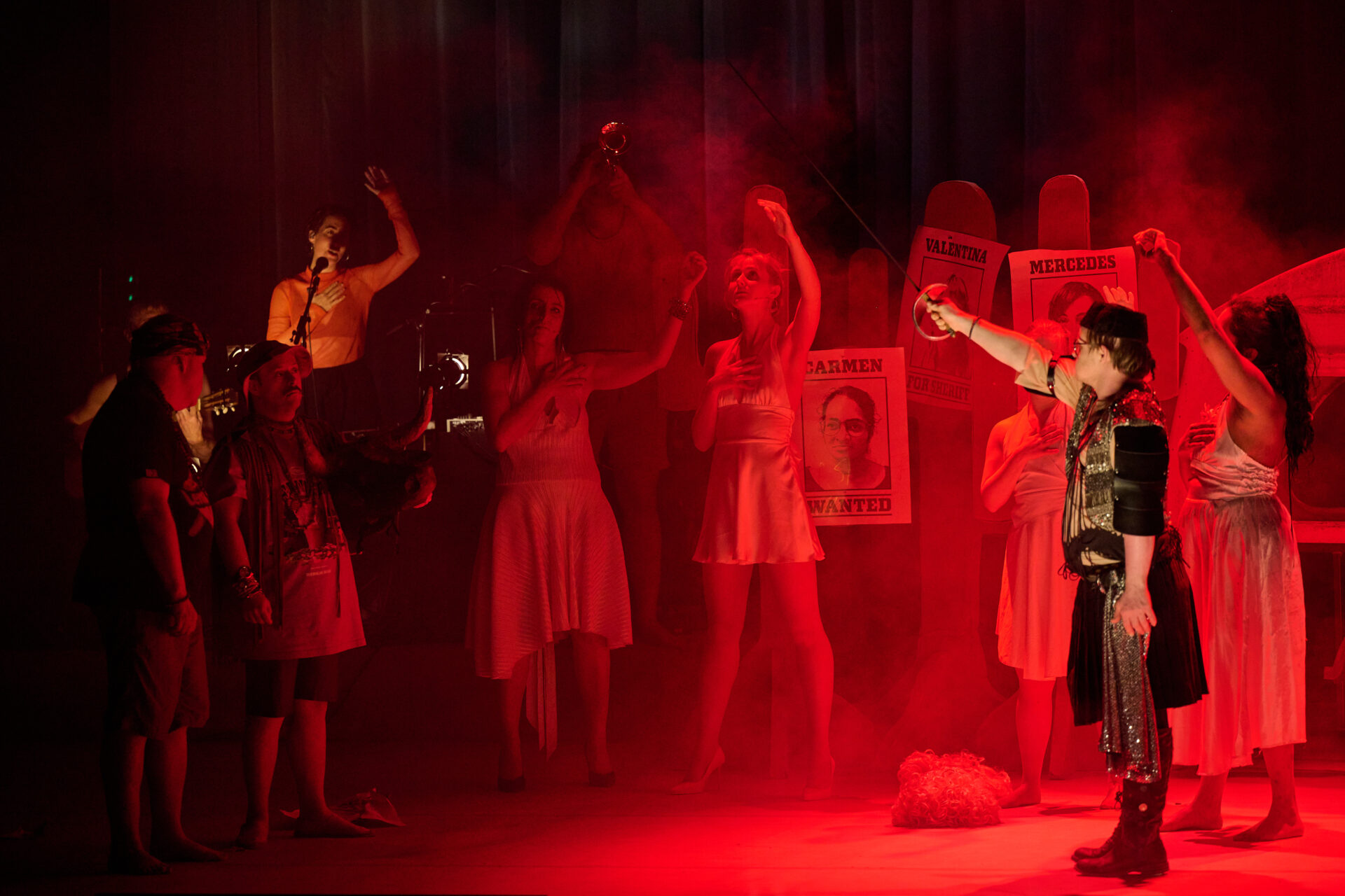 Jedenfalls zunächst. Carmen tritt als selbstbewusste Frau auf. Sie bewegt sich sicher im Raum, weiß um ihre Wirkung und nutzt sie bewusst. Ihre Stärke wirkt bei Hazina Kenis authentisch, doch bleibt sie vor allem auf der Ebene der äußeren Darstellung. Eine tiefere Verletzlichkeit oder innere Spannung zeigt sie kaum – wohl auch, weil die Inszenierung sie als Symbol für Freiheit und Unabhängigkeit festlegt. In einem großen Schlussbild findet der Abend einen Umgang mit dem tödlichen Schuss auf Carmen durch ihren Geliebten, mit dem sich jede „Carmen“ auseinandersetzen muss. In einem Monolog stellt Hazina Kenis Fragen, die bekannt sind aus Strukturen der Täter-Opfer-Umkehr. Die gesellschaftlichen Ausschlüsse (Behinderung, Hautfarbe, Körperbild) als Begründung für den tödlichen Schuss stellt die Schauspielerin auf der Bühne infrage. Ihre Freundinnen aus dem Camperwagen stimmen ein – so wird ein feministischer Moment aus dem eigentlichen Todesschuss, in dem alle Frauen auf der Bühne in gleicher Geste den linken Arm heben.