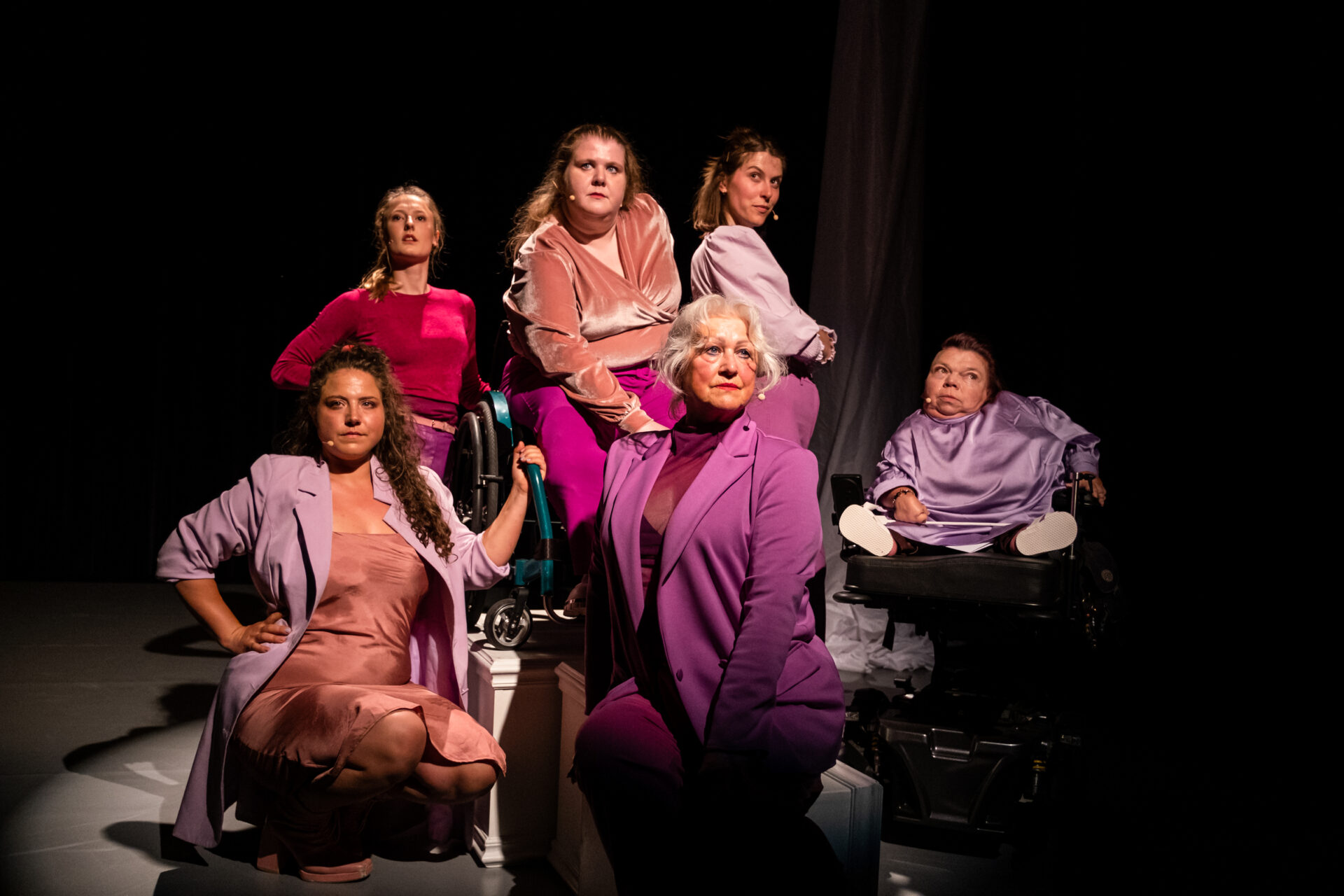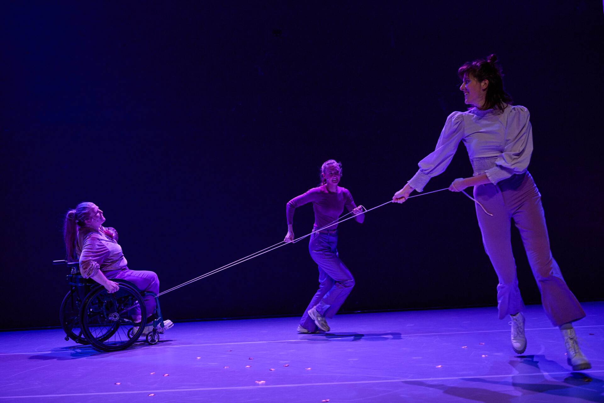 Auch musikalisch kommt man in eine berauschte Stimmung. Die Frauen tanzen und lipsyncen zu Britney Spears „Oops! … I Did It Again“. Sie feiern die hängende Haut im steigenden Alter mit dem Lied „Schudden“ von Def Rhymz und schütteln einmal alles, was sich am Körper schütteln lässt. Gegen Ende kommt es aber auch zu einem sehr gefühlvollen Tanz-Moment. Die Darstellerinnen Femke Arnouts, Marloes Dingshoff und Ella de Coninck tanzen zum Lied „Play With Me“ von Rendezvous At Two. An das Bein des Rollstuhls von Marloes Dingshoff wird ein Seil gebunden, die anderen beiden ziehen sie daran und gleiten gemeinsam durch den ganzen Bühnenraum. Ella de Coninck setzt sich auf Dingshoffs Schoß, sie sind sehr innig und sinnlich miteinander, als Femke Arnouts sie schwungvoll über den Boden fährt. De Coninck bewegt sich grazil und elegant, als zeigte sie Hebefiguren von Eiskunstläufer*innen. Alle scheinen über den Boden zu schweben, lassen jede Bewegung federleicht aussehen.