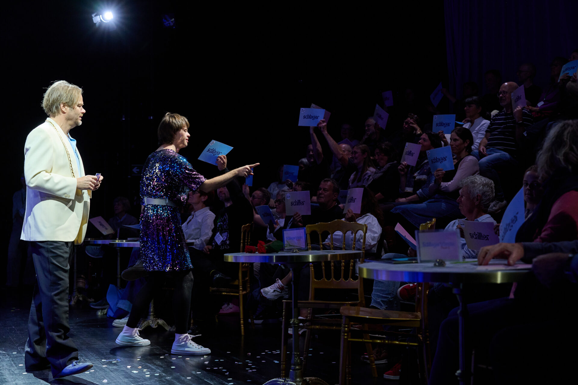 Die ganze Aufführung ist gespickt mit Publikumsinteraktionen. Tima und Klaus verteilen Autogrammkarten mit persönlicher Widmung und laden am Ende dazu ein, gemeinsam auf der Bühne zu Marianne Rosenbergs “Ich bin wie du” zu tanzen. Einer der Höhepunkte des Abends ist das Quiz „Schiller oder Schlager“. Dabei bekommen alle Zuschauenden große, doppelseitig bedruckte Karten. Auf der einen Seite steht „Schiller“ und auf der anderen „Schlager“. Dazu sind zwei Symbole – Noten und Buch – aufgedruckt, um mehr Teilhabe zu ermöglichen. Nacheinander lesen Tima und Klaus Zitate vor und die Zuschauer:innen sollen raten, ob das Zitat von Schiller oder aus einem Schlager stammt.. Schnell wird deutlich: So weit liegen die beiden nicht auseinander.