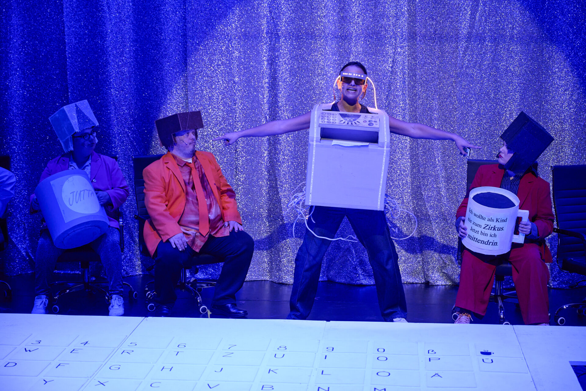 Auf einer riesigen Tastatur, in die drei Trampoline eingelassen sind, lehnen die Kolleginnen Anträge ab und üben das Aufsagen der Wartenummern. Dafür springen sie auf den Buchstaben hin und her. Kollegial wird die Arbeit aufgeteilt, sodass sich niemand zu sehr anstrengen muss – „aber Drei-Tage-Woche ist zu krass“. Sechs Bürostühle stehen zwischen dieser erhöhten Tastatur und einem silbernen Glitzervorhang an der Bühnenrückwand. An ihm ist zentral eine Uhr befestigt, die um kurz vor zwölf stehengeblieben ist. Rechts daneben befindet sich die Band, welche ebenfalls in der Verwaltung arbeitet, beziehungsweise Pausen macht.